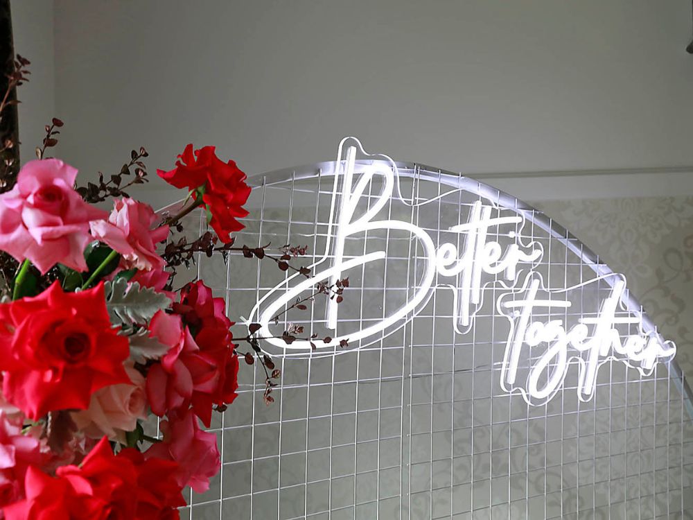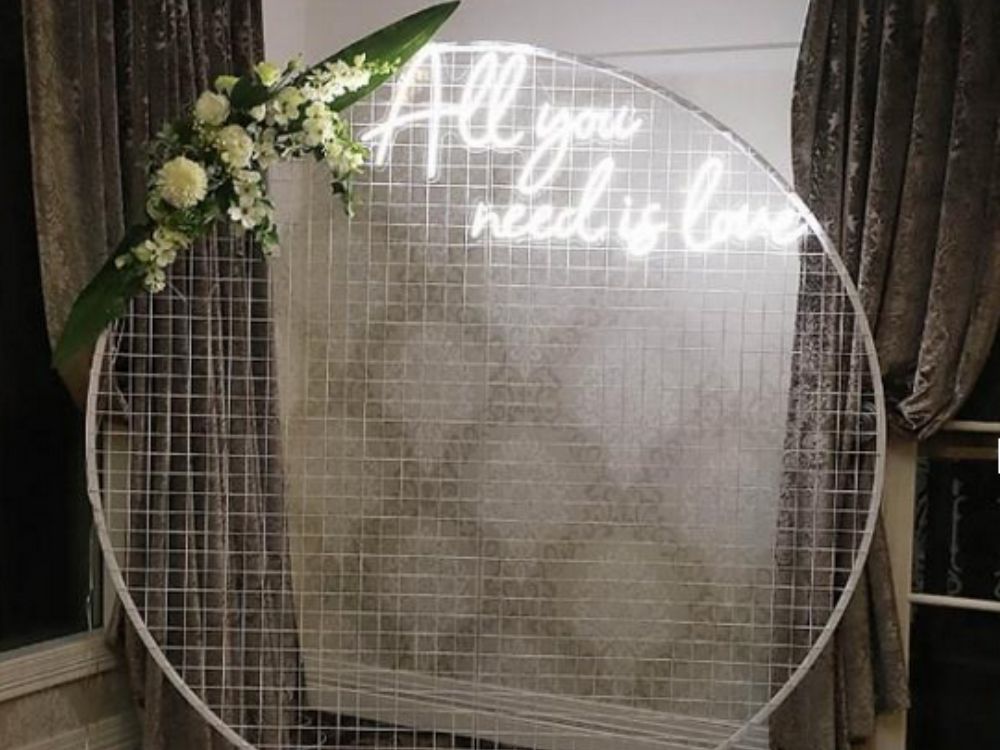 The plain mesh wall is available in white, which you can hire on its own, or include one of our neon signs available in two different phrases.