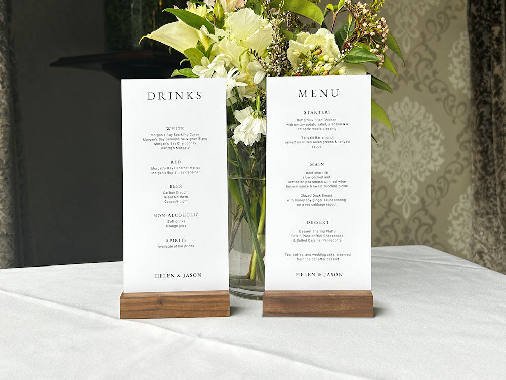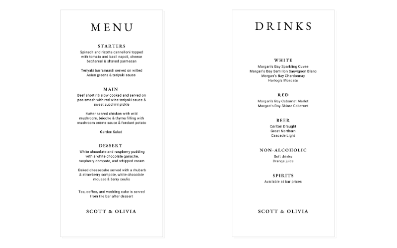 Make your event even more special with personalised menus featuring your names and a selection of food and beverages listed on either side.